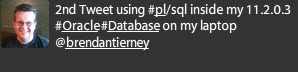 Over the past couple of weeks I have been looking at some PL/SQL code that allows me to post messages to my twitter account (@brendantierney). You may have seen these. They looked something link the following.