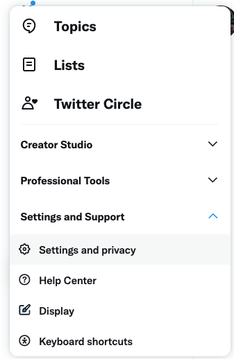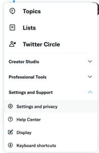 1. To to your Twitter home page, and click on the More icon in the menu on the left hand side of the page. Select “Settings and Support” from the menu options. Click “Settings and privacy.” Select “Your account” from the menu options.