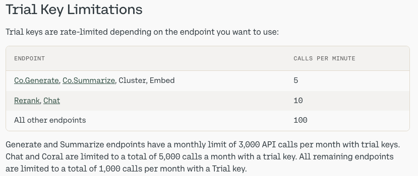 When you sign-up to Cohere, you are initially creating a Trial (Free) account. For now, this will be enough for playing with Select AI. There are some restrictions (shown below) but these might change over time so make sure to check this out.