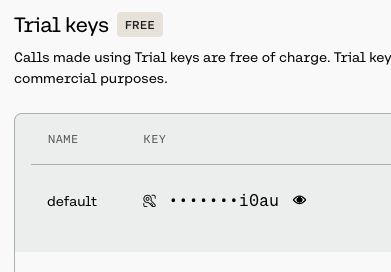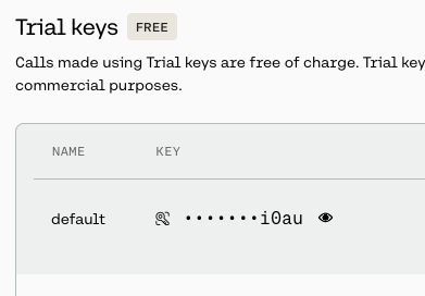 From your Cohere Dashboard, you can access your API key, and use this to set-up your access to the LLM from your remote (app, database, etc) environment. This is a Trial API Key, that is rate-limited, so is kind of ok for testing and evaluation. If you need more, you’ll need to upgrade your account.