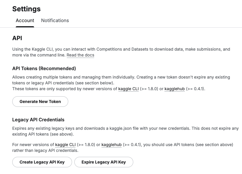Before we do anything else in the Jupyter Notebook, you will need to log into the Kaggle website and get and API Key Token for your account
