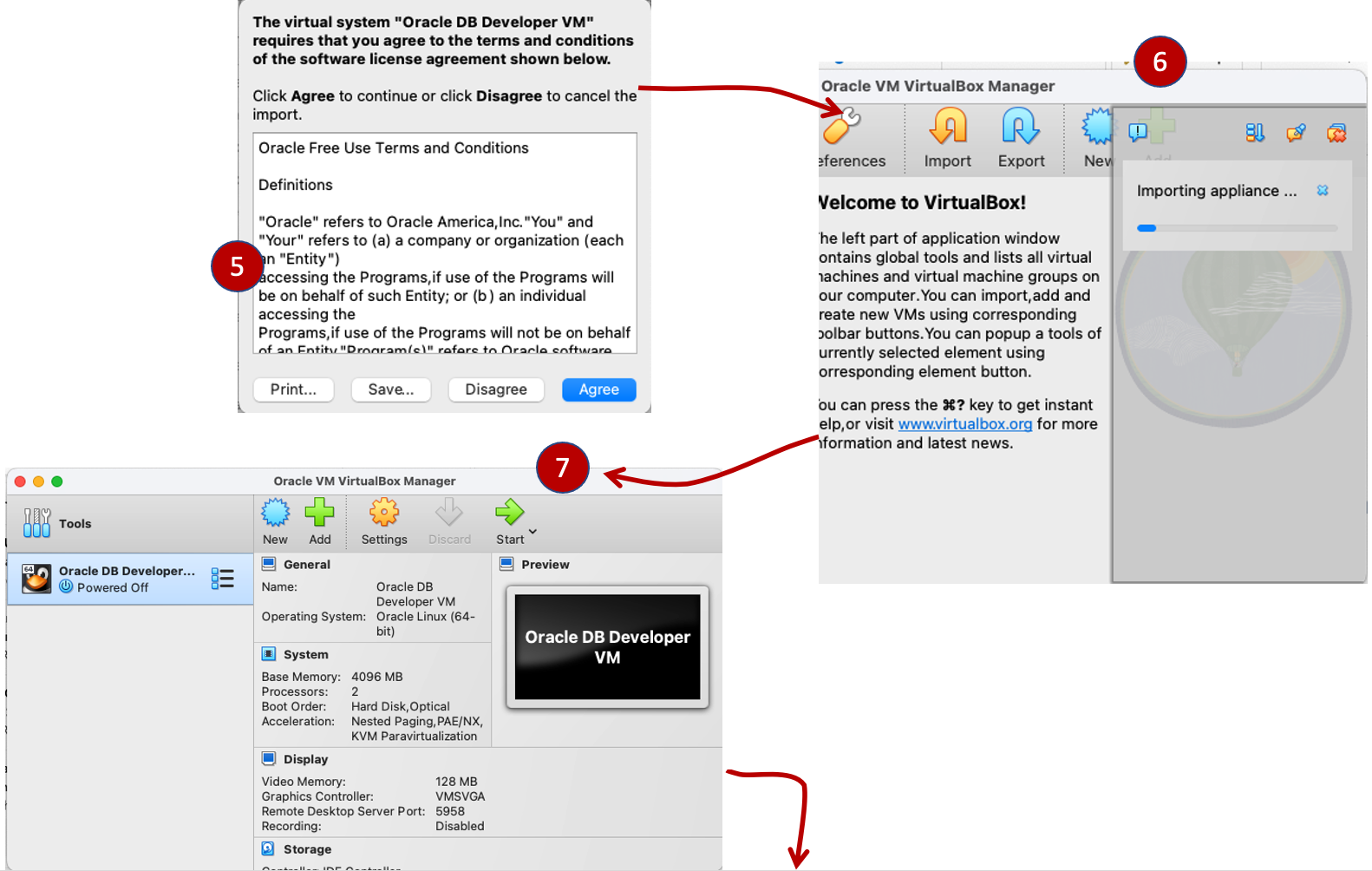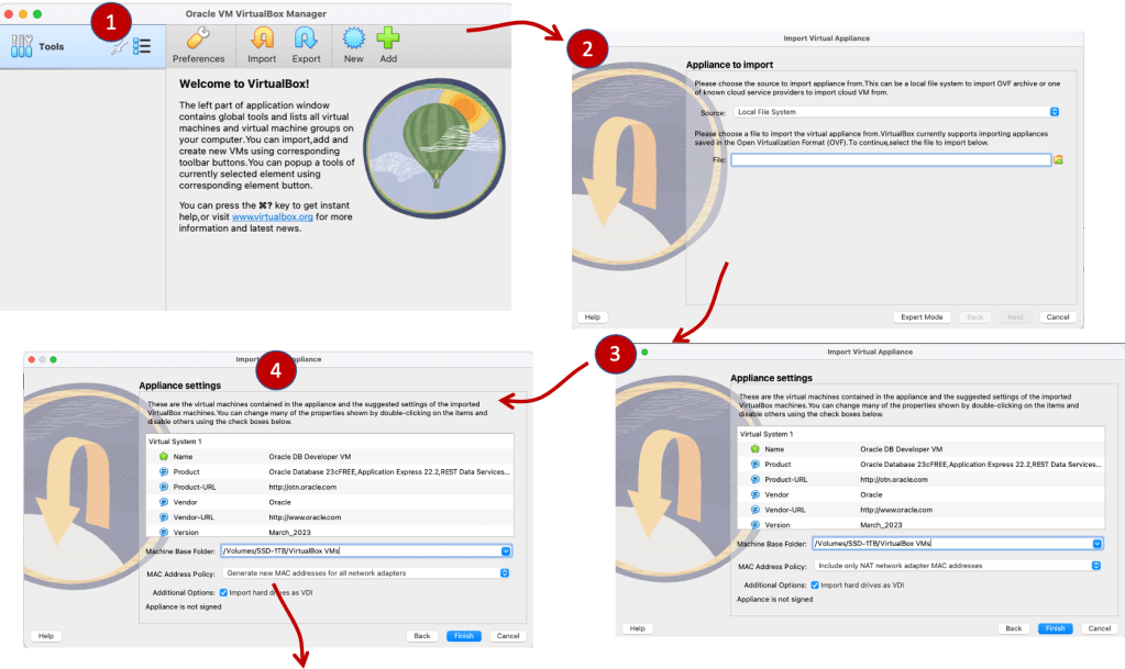 In addition to the Docker image for 23c Free, they have also made available a Virtual Machine (VM) which you can import into VirtualBox. The steps outlined below are what you need to follow to complete this installation/setup of the VM. This also assumes you have installed VirtualBox.