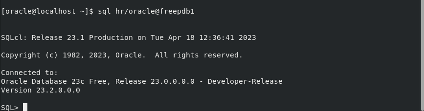 The VM is configured with port forwarding, which means you can treat the VM as a server and run commands from your computer (as a client machine. Alternatively, you can open a terminal window in the VM and run SQLcl. The following illustrates connecting to the database using SQLcl on the VM.