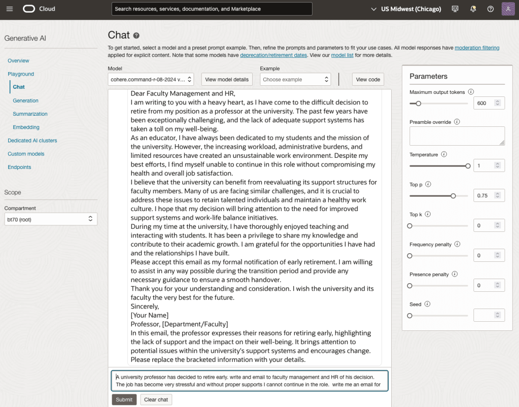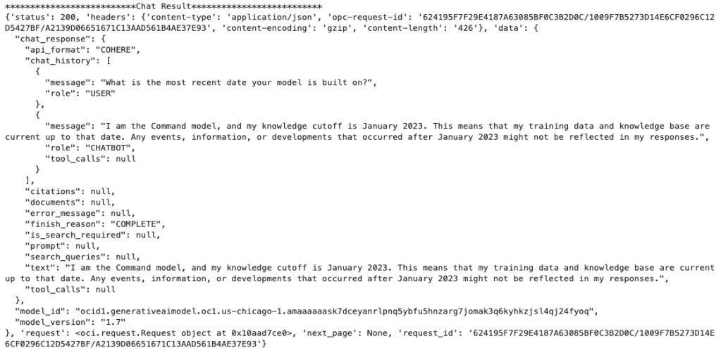 We have seen in my previous posts how the PL/SQL package called DBMS_CLOUD_AI was used to create a profile. This profile provided details of what provided to use (Cohere or OpenAI in my examples), and what metadata (schemas, tables, etc) to send to the LLM. When you look at the DBMS_CLOUD_AI PL/SQL package it only contains seven functions (at time of writing this post). Most of these functions are for managing the profile, such as creating, deleting, enabling, disabling and setting the profile attributes. But there is one other important function called GENERATE. This function can be used to send your request to the LLM.