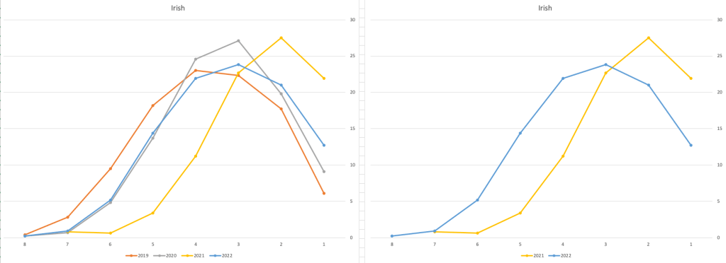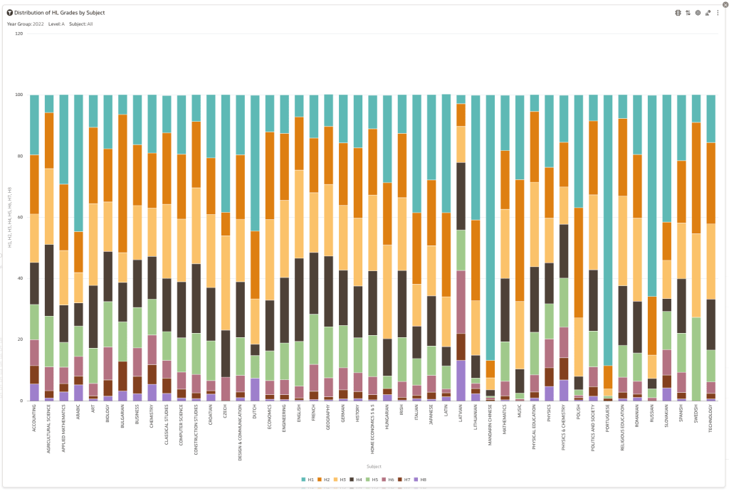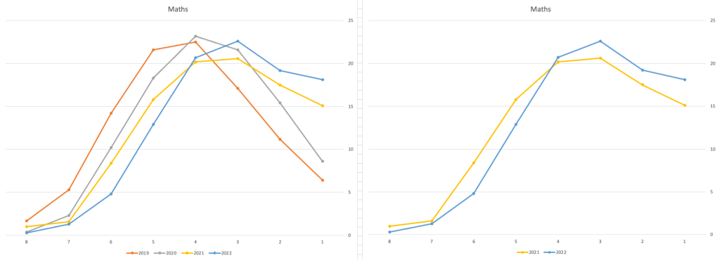 For English, it looks like they fitted to the curve perfectly! keeping grades in-line between the two years. Mathematics is a little different with a slight increase in grades. But when you look at Irish we can see there was definite grade deflation. For each of these subjects, the chart on the left contains four years of data including 2019 when the last “normal” leaving certificate occurred. With Irish the grade profile has been adjusted (deflated) significantly and is closer to 2019 profile than it is to 2021. There was been lots and lots of discussions nationally about how and when grades will revert to normal profile. The 2022 profile for Irish seems to show this has started to happen in this subject, which raises the question if this is occurring in any other subjects, and is hidden/masked by the “in-line on aggregate” figures.