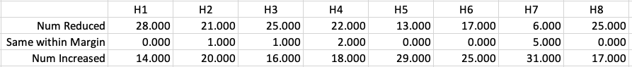 This table in very interesting in that more subjects decreased their H1s, with some variation for the H2-H4s, while for the lower range of H5-H7 we can see there has been an increase in grades. If I increased the margin to 3% we get a slightly different results, but only minor changes.