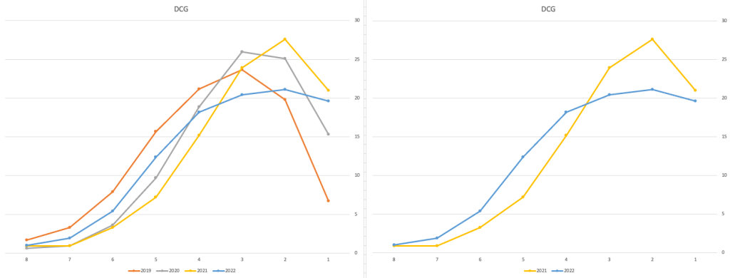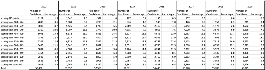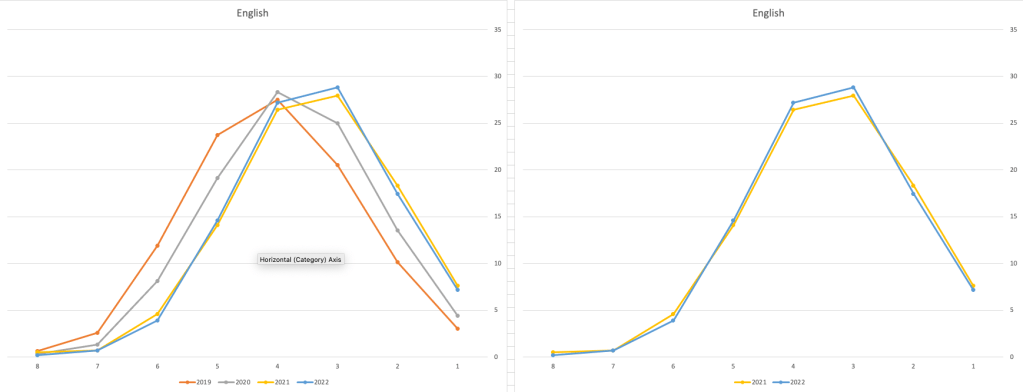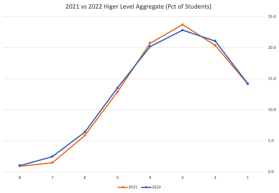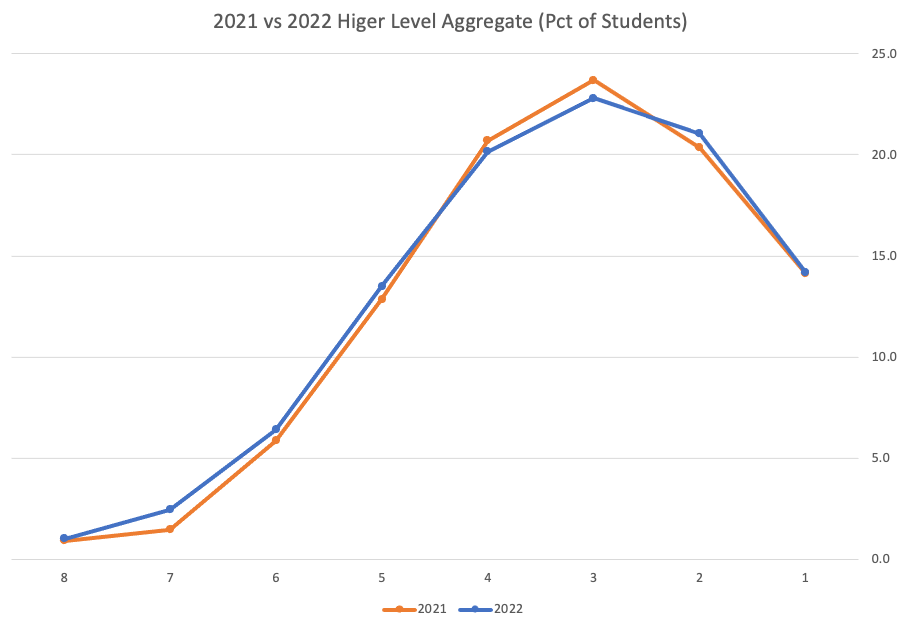 This chart clearly shows a shifting of the profile to the left for the red line which represents 2022. This also supports my blog post last week, and that the Dept of Education has started the process of deflating marks.