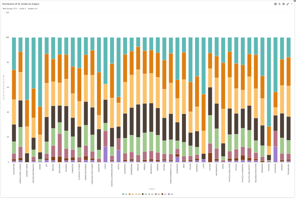 For the analysis presented in this blog post, I’ve just looked at results at Higher Level across all subjects, and for the deeper dive I’ll look at some of the most popular subjects.