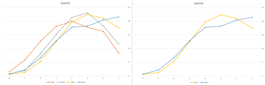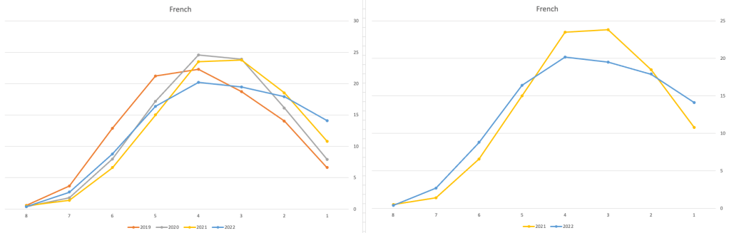 Again we can see some grade deflation, although not to be same extent as Irish. For both French and Spanish, we have reduced numbers for the H2-H4 range and a slight increase for H5-H7, and shift to the left in the profile. A slight exception is for those getting a H1 for both subjects. The adjustment in the results profile is more pronounced for French, and could indicate some deflation adjustments.