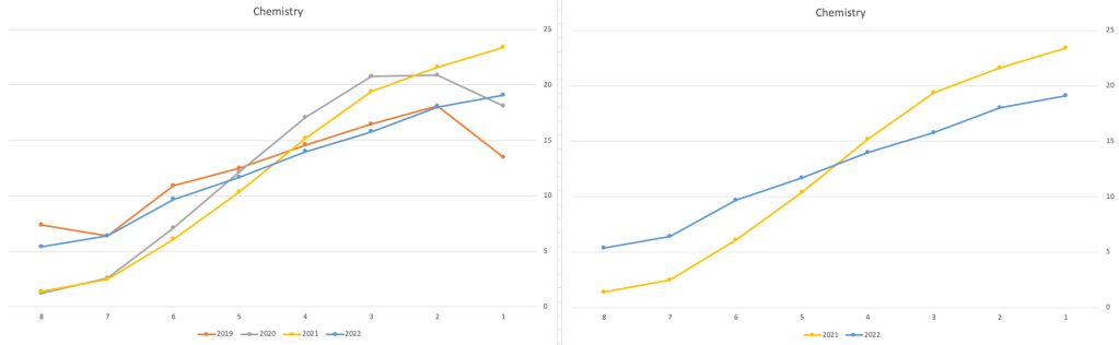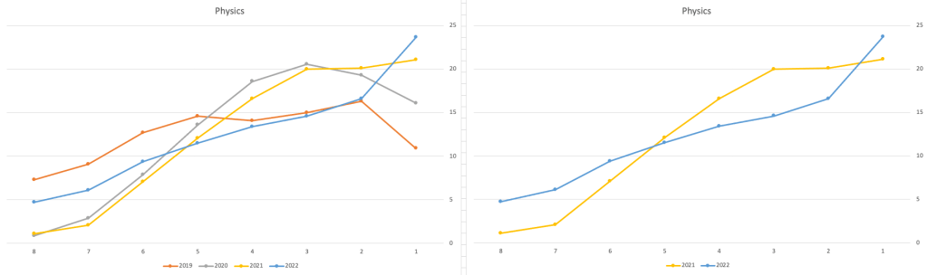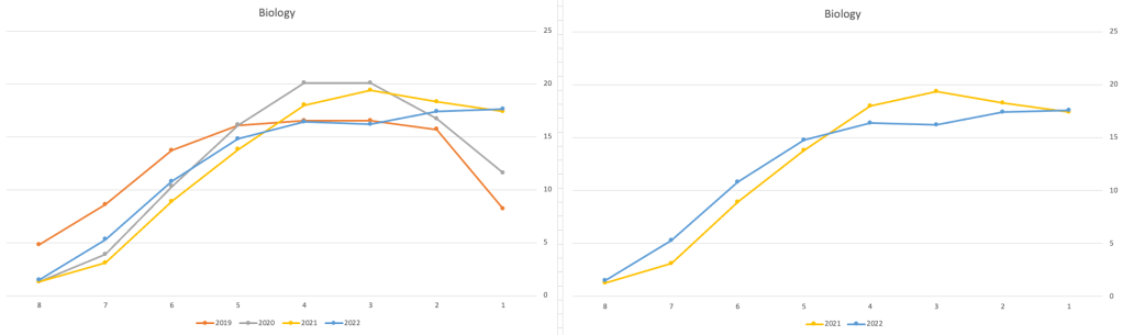 These three subjects also indicate some adjusts back towards the pre-Covid profile, with exception of H1 grades. We can see the 2022 profile almost reflect the 2019 profile (excluding H1s) and for Biology appears to be at a half way point between 2019 and 2022 (excluding H1s)