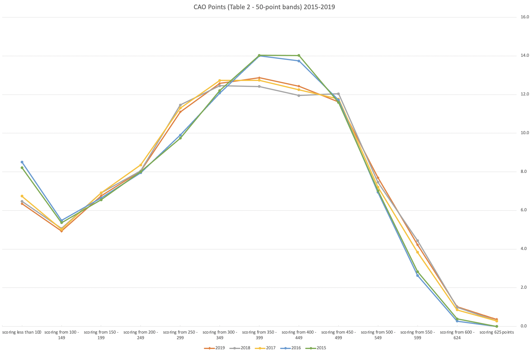 I didn’t go into how that might impact on the CAO (Central Applications Office) Points. If there was deflation in some of the core and most popular subjects, then you might conclude there could be some changes in the profile of CAO Points being awarded, and that in turn would have a small change on the CAO Points needed for a lot of University courses. But not all of them, as we saw last week, the increased number of students who get grades in the H4-H7 range. This could mean a small decrease in points for courses in the 520+ range, and a small increase in points needed in the 300-500-ish range.