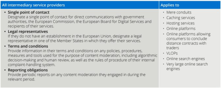 - Intermediary service providers are online services which consist of either a “mere conduit” service, a “caching” service; or a “hosting” service. Examples include online search engines, wireless local area networks, cloud infrastructure services, or content delivery networks.