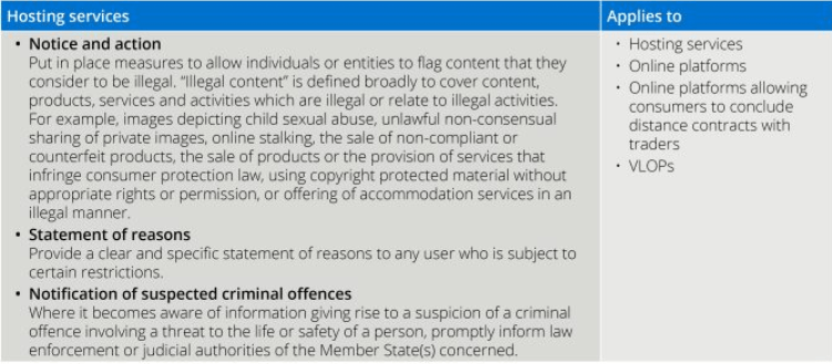 - Ensuring that digital service providers take responsibility for the content on their platforms and that they have effective measures in place to combat illegal content, such as hate speech, terrorist content, and counterfeit goods.