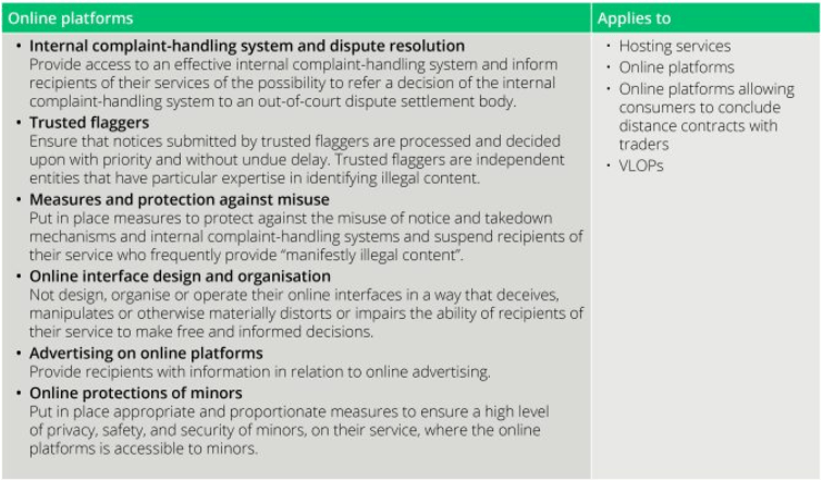 - Online Platforms are hosting services which also disseminate the information they store to the public at the user’s request. Examples include social media platforms, message boards, app stores, online forums, metaverse platforms, online marketplaces and travel and accommodation platforms.
