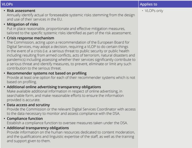 The DSA takes a layered approach to regulation. The basic obligations under the DSA apply to all online intermediary service providers, additional obligations apply to providers in other categories, with the heaviest regulation applying to very large online platforms (VLOPs) and very large online service engines (VLOSEs).