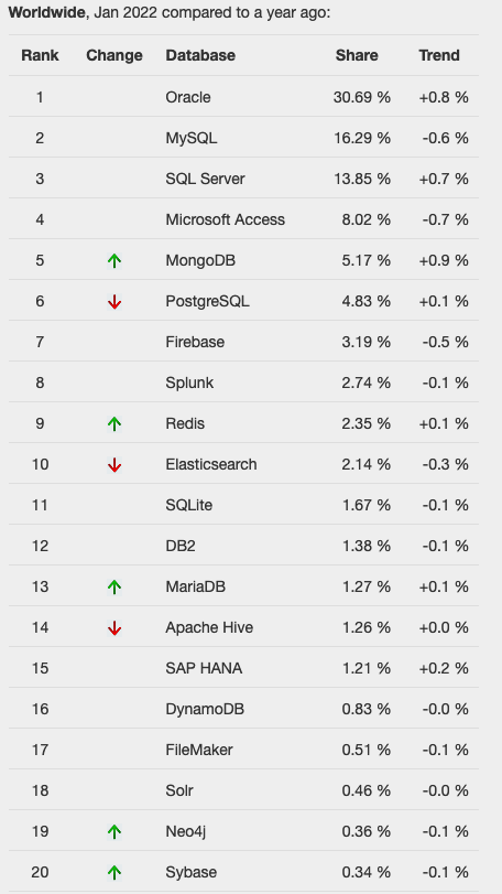 One of the most common sites is DB-Engines, and another is TOPDB Top Database index. The images below show the current rankings/positions of the database vendors (in January 2022).