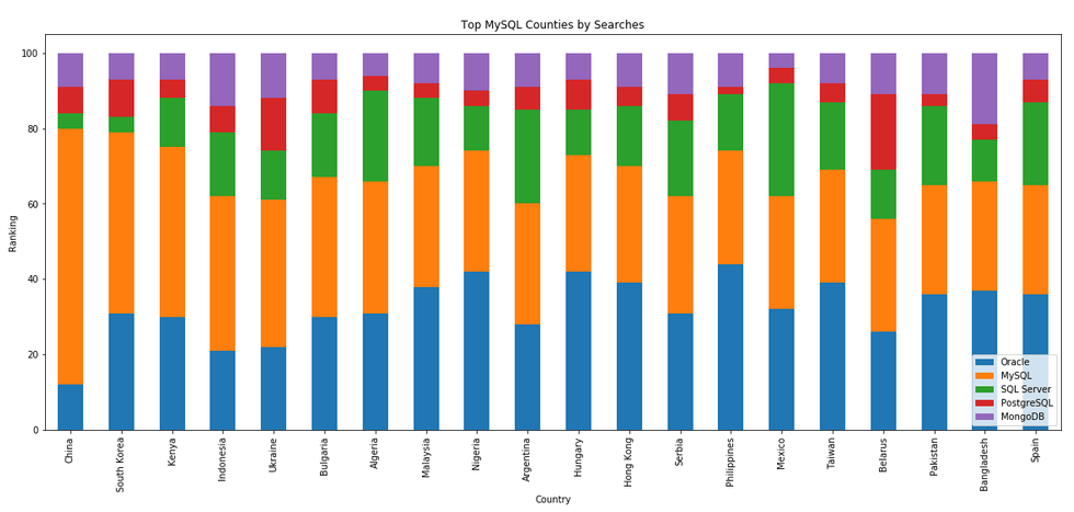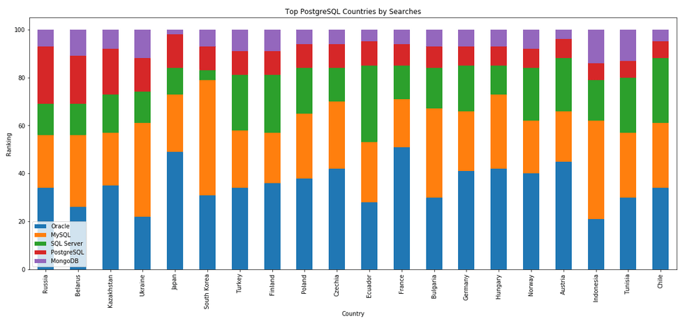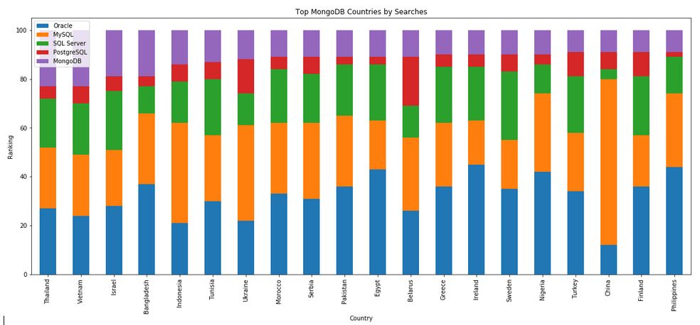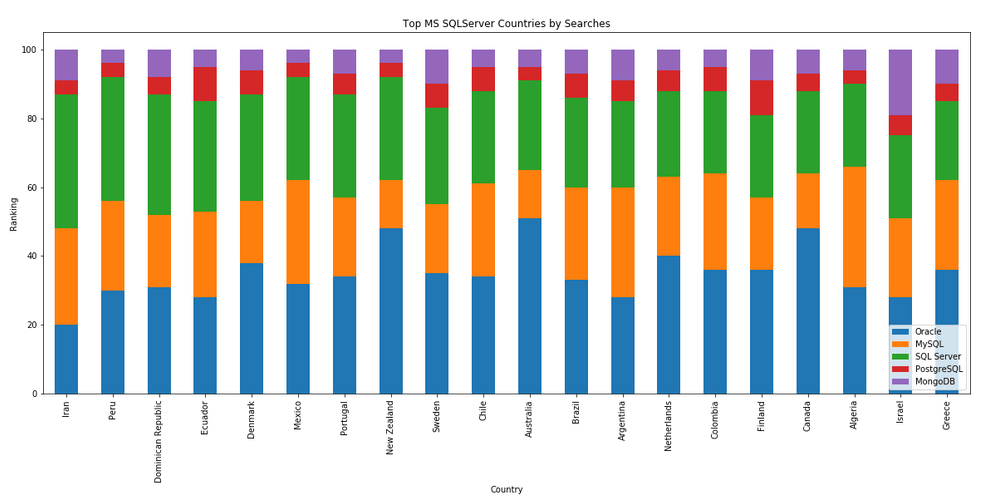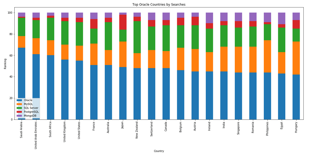 I’ve previously written about using the Python pytrends package to explore the relative importance of the different Database engines. The results from pytrends gives results based on number of searches etc in Google. Check out that Blog Post. I’ve rerun the same code for 2021, and the following gallery displays charts for each Database based on their popularity. This will allow you to see what countries are most popular for each Database and how that relates to the other databases. For these charts I’ve included Oracle, MySQL, SQL Server, PostgreSQL and MongoDB, as these are the top 5 Databases from DB-Engines.