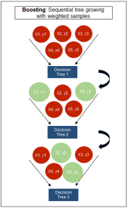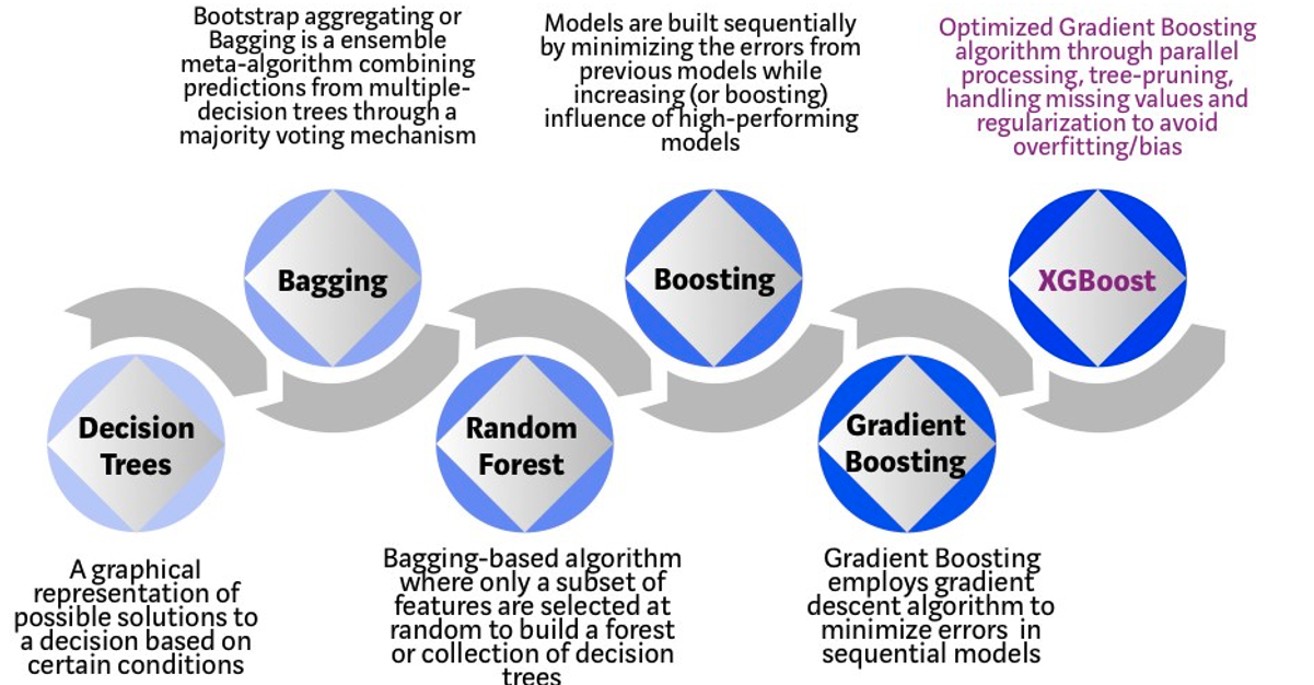Regular machine learning models, like Decision Trees, simply train a single model using a training data set, and only this model is used for predictions. Although a Decision Tree is very simple to create (and very very quick to do so) its predictive power may not be as good as most other algorithms, despite providing model explainability. To overcome this limitation ensemble approaches can be used to create multiple Decision Trees and combines these for predictive purposes. Bagging is an approach where the predictions from multiple DT models are combined using majority voting. Building upon the bagging approach Random Forest uses different subsets of features and subsets of the training data, combining these in different ways to create a collection of DT models and presented as one model to the user. Boosting takes a more iterative approach to refining the models by building sequential models with each subsequent model is focused on minimizing the errors of the previous model. Gradient Boosting uses gradient descent algorithm to minimize errors in subsequent models. Finally with XGBoost builds upon these previous steps enabling parallel processing, tree pruning, missing data treatment, regularization and better cache, memory and hardware optimization. It’s commonly referred to as gradient boosting on steroids.