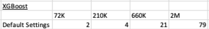 One of the interesting things I found when experimenting with XGBoost was the time it took to create the completed model. Using the default settings the following table gives the time taken, in seconds to create the model.