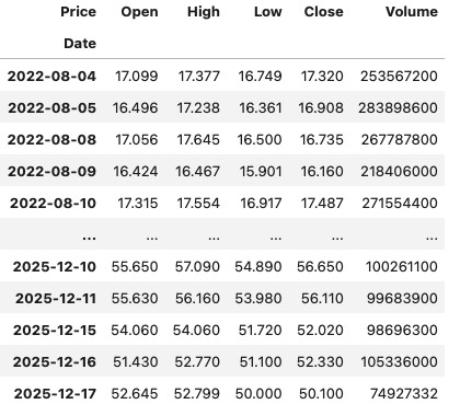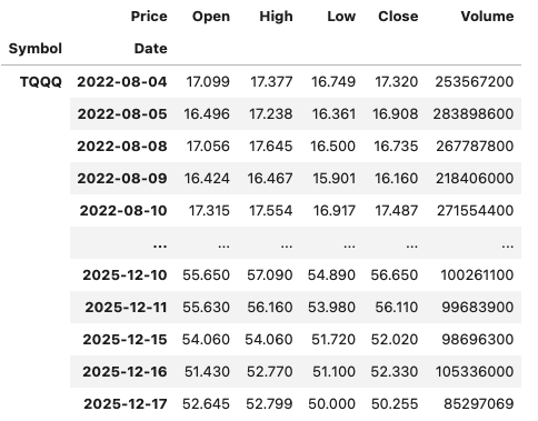 In this demo scenario, we are using yfinance to get data on various stocks. After the data is downloaded we get something like this.