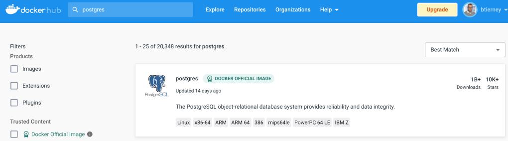 The first step is go to Docker Hub and locate the page for Postgres. You should see something like the following. Click through to the Postgres page.