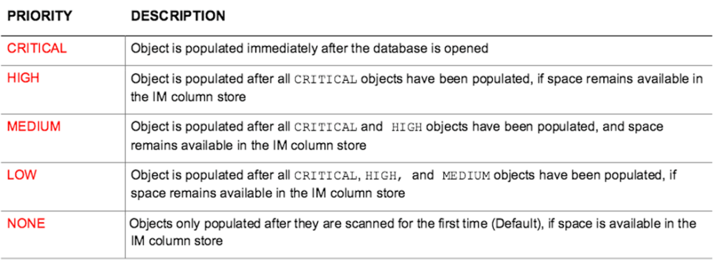 SQL> ALTER TABLE customers INMEMORY PRIORITY CRITICAL;
