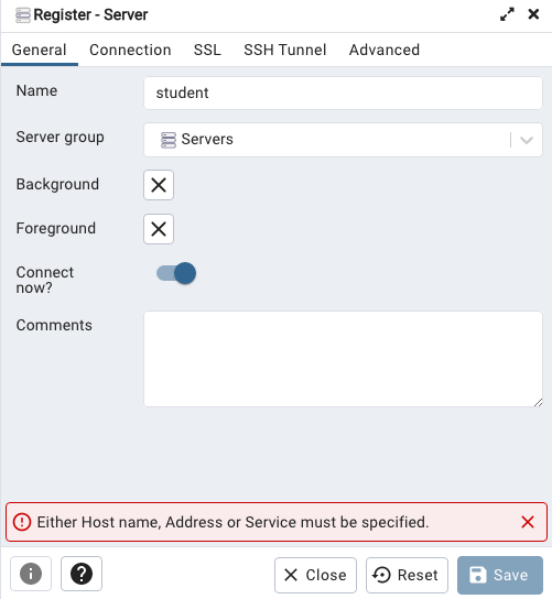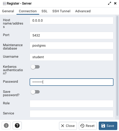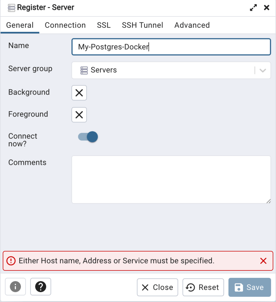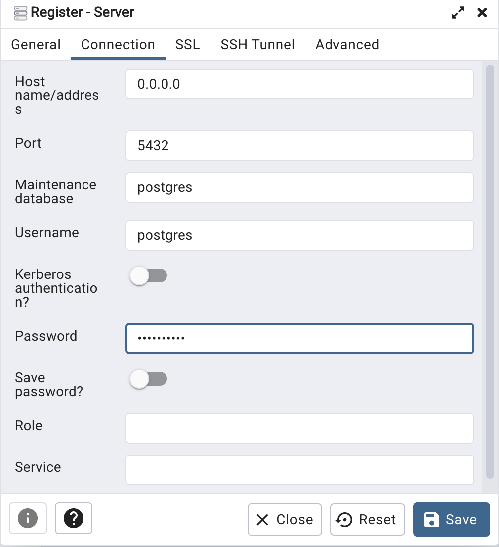 Then create (or Register) a connection to your Postgres Database. Enter the details you used when creating the docker image including username=postgres, password=pgPassword and IP address=0.0.0.0.