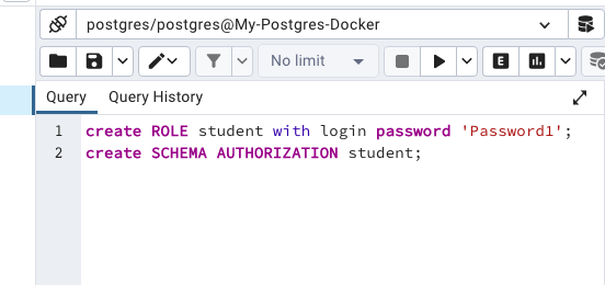 When your (above) connection works, the next step is to create another schema/user in the database. The reason we need to do this is because the user we connected to above (postgres) is an admin user. This user/schema should never be used for database development work.