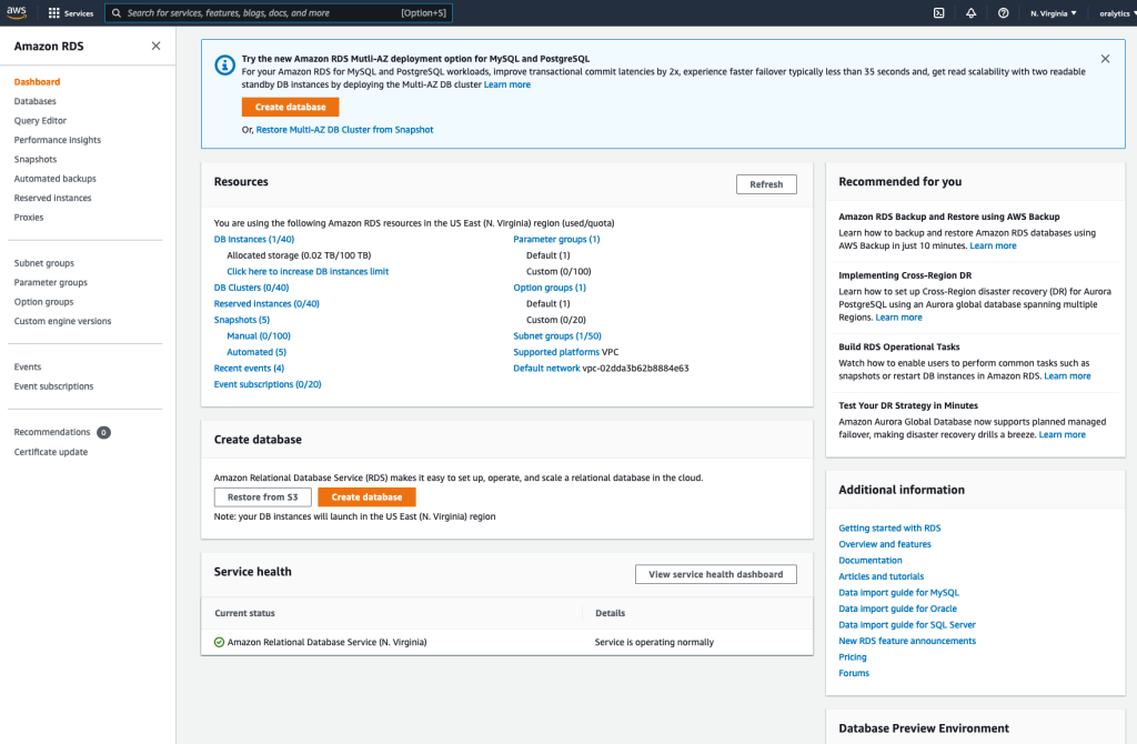 After creating your account and you have logged in, search for RDS and you will get the following display. Click on the orange button at the top of the page to Create Database.