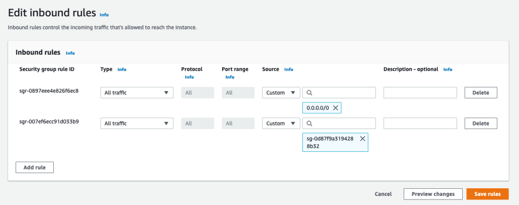 Then click on the ‘Edit Inbound rules’ button, and then on the ‘Add Rule’ button (bottom left) to add a new rule. Then select ‘All Traffic’ from drop down, and 0.0.0.0/0 in the Source field. Then save the rules.