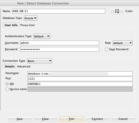 You are now ready to create a connection using SQL Developer. To do this you will need database Endpoint from the RDS dashboard. You will also need the DB Name. This can be found by clicking on the ‘Configuration’ tab, and is listed on left-hand side under DB Name