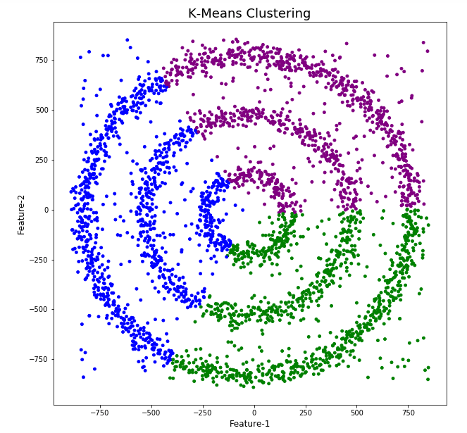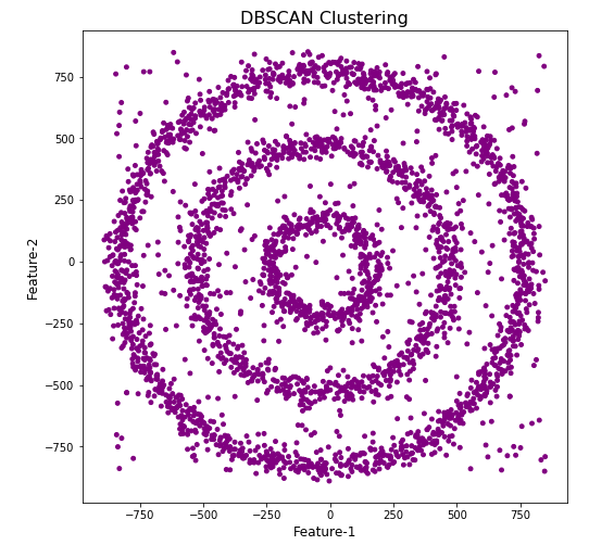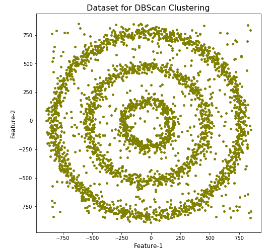 We can see the dataset we’ve just created has three distinct circular patterns of data. We also added some noisy data too, which can be see as the points between and outside of the circular patterns.