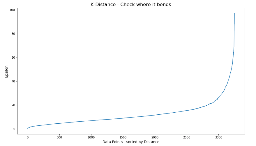 Look at the graph above we can see the main curvature is between 20 and 40. Taking 30 at the mid-point of this we can now use this value for epsilon. The value for the number of samples needs some experimentation to see what gives the best fit.