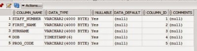 When we look at this newly created table in our Oracle schema we will see that we don’t have DATA datatype for DOB, but instead it is created using a TIMESTAMP data type.